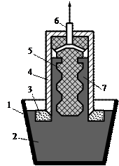 Рис. 3.26. Изготовление отливки литьём вакуумным всасыванием: 1 – нагреваемый тигель; 2 – расплавленный металл; 3 – керамический поплавок; 4 – водоохлаждаемая литейная форма; 5 – стержень; 6 – труба вакуумного насоса; 7 – отливка | Для литья вакуумным всасыванием (рис. 3.26) используется нагреваемый тигель 1, содержащий расплавленный металл 2, на поверхности которого находится керамический поплавок 3. К поплавку плотно прижимается водоохлаждаемая литейная форма 4, содержащая закреплённый внутри неё стержень 5, предназначенный для получения в отливке полости требуемой конфигурации. Когда вакуумный насос через трубу 6, соединённую с отверстиями стержня 5, начинает откачивать воздух, в полости литейной формы 4 создаётся разряжение, в результате чего она начинает заполняться металлом, образующим отливку 7. После затвердевания отливки полость формы 4 соединяется с атмосферой, и незатвердевший металл сливается в нагреваемый тигель 1. Преимущество литья вакуумным всасыванием состоит в устранении брака по газовым раковинам и пористости путём всасывания выделяющихся газов и последовательной кристаллизации отливки. Этим способом изготавливают разнообразные втулки, кольца, гайки, цилиндры, колёса компрессоров и другие отливки преимущественно из цветных металлов и сплавов, в частности, медных и алюминиевых. |