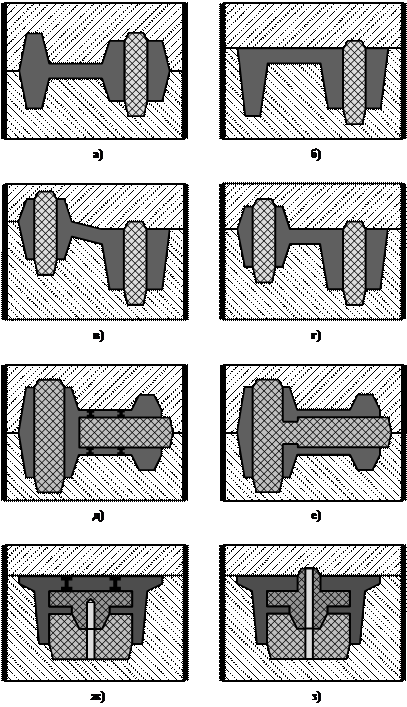 (рис. 3.27- е), т.к. увеличение количества стержней (рис. 3.27- д) повышает стоимость их изготовления и трудоёмкость их установки, часто требует применения жеребеек с присущими им недостатками, повышает вероятность перекоса одной полости относительно другой при неточной установке любого из стержней; 4) форма отливки в соответствующих случаях не только обеспечивала удобную установку и надёжное крепление стержней, но и свободный выход газов из их вентиляционного отверстия (рис. 3.27- з), поскольку в противном случае (рис. 3.27- ж) возрастает вероятность брака из-за газовой пористости, а также уменьшается доступ для последующего удаления стержня из поднутрения верхней полости.