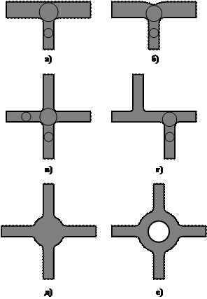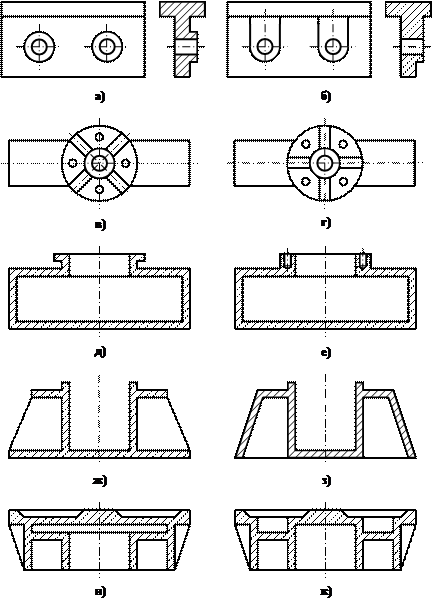 Рис. 3.32. Примеры повышения технологичности сопряжений стенок отливок: а – скопление металла в тавровом узле; б – уменьшение скопления металла с помощью технологического углубления; в – скопление металла в крестообразном узле; г – уменьшение скопления металла с помощью смещения одной стенки; д – скопление металла в цилиндрическом узле; е – уменьшение скопления металла с помощью отверстия | ||||
