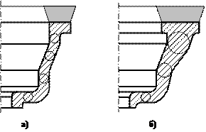 Рис. 3.29. Конструкции отливок, обеспечивающие их одновременное (а) и направленное (б) затвердевание | При конструировании мелких и средних тонкостенных отливок целесообразно применять принцип одновременного затвердевания, который достигается равномерной толщиной стенок (рис. 3.29- а); участок, застывающий последним, подпитывается прибылью. При конструировании отливок с повышенными требованиями по плотности и герметичности, особенно из материалов с повышенной усадкой, применяют принцип направленного затвердевания, достигаемый плавным увеличением толщины стенок в направлении установки прибыли (рис. 3.29- б). | |||
