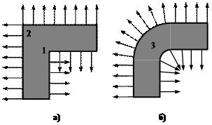 Рис. 3.30. Нетехнологичная (а) и технологичная (б) конструкция углового термического узла: 1 – застывание этого угла замедлено из-за сильного нагрева прилегающего участка формы пересечением тепловых потоков; 2 – застывание этого угла ускорено из-за одновременной теплоотдачи в двух взаимно перпендикулярных направлениях и соприкосновения с мало нагретым участком формы; 3 – скруглением углов достигнута бόльшая равномерность тепловых потоков вдоль поверхностей контакта отливки и формы | Для снижения усадочных и термических напряжений, а также вероятности трещинообразования следует избегать термических узлов, которые возникают в местах неравномерного распределения тепловых потоков, идущих от поверхностей отливки в форму (рис. 3.30- а). Для выравнивания теплоотвода следует избегать резких изменений направления контактных поверхностей отливки, т.е. нужно такие части отливки выполнять скруглёнными (рис. 3.30- б). При этом желательно, чтобы толщины стенок на сопрягаемых участках не отличались более чем в 4 раза. Сопряжения стенок, отличающихся по толщине менее чем в 2 раза, выполняют в виде галтелей (рис. 3.31- а), а при отличии по толщине в 2 раза и более для повышения плавности рекомендуется выполнять переход в виде галтелей с клиновым переходом (рис. 3.31- б). |