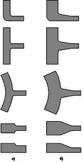 Рис. 3.31. Рекомендуемые переходы от одной стенки отливки к другой: а – в виде галтелей при перепаде толщин менее чем в 2 раза; б – в виде галтелей с клиновым переходом при перепаде толщин в 2 раза и более |