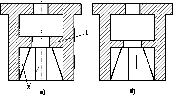 Рис. 3.34. Нетехнологичная одинаковая толщина внутренних и наружных элементов отливки (а) и технологичная меньшая толщина внутренних элементов отливки по сравнению с наружными (б): 1 – внутренняя полка; 2 – внутренние рёбра | ||||