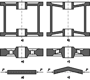 Возникновение остаточных напряжений, коробления и трещин в отливках барабанов, зубчатых колес, маховиков, шкивов и рукояток вентилей связано с различной скоростью охлаждения обода, ступицы и соединяющих их дисков или спиц. Для снижения усадочных напряжений и предотвращения трещинообразования и коробления целесообразно плоские соединительные элементы (рис. 3.35- а, в) заменять коническими (рис. 3.35- б, г) или иной неплоской формы. Из сопротивления материалов известно, что прямолинейный брус, нагруженный осевыми сжимающими силами Р (рис. 3.35- д), будет работать только на сжатие и в этом случае оказывать большое сопротивление деформации. Но если ось бруса изогнута (рис. 3.35- е), то помимо сжимающих сил на брус будут действовать и изгибающие моменты, вызывающие намного большие перемещения, чем простое сжатие. Таким образом, неплоские соединительные элементы будут обладать значительно большей радиальной податливостью, чем плоские, и поэтому будут оказывать значительно меньшее сопротивление усадке более мощного внешнего обода. Кроме того, опыт показывает, что при заливке наклонных щелей улучшается вывод газов из формы, т.е. снижается вероятность образования газовых раковин или пористости.
