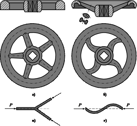 Рис. 3.36. Технологичные литые рукоятки вентилей: а – рукоятка с нечётным числом прямолинейных спиц; б – рукоятка с чётным числом изогнутых спиц; в – силовая схема, объясняющая увеличение податливости при нечётном количестве прямолинейных спиц (направленная вдоль спицы сила Р далее проходит через пустоту и может отгибать наклонные спицы); г – силовая схема, объясняющая увеличение податливости при чётном количестве изогнутых спиц (форма спиц облегчает их деформацию за счёт изгиба сжимающими силами Р)