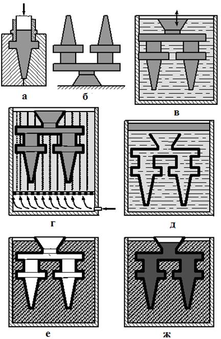 Модельная смесь в пастообразном или жидком состоянии запрессовывается в разъемную пресс-форму требуемой конфигурации (рис. 12Л, а). После затвердевания модельного состава пресс-форма раскрывается, полученные модели извлекаются и приклеиваются к легкоплавкой модели литниковой системы (рис. 12Л, б), образуя общий блок. В один блок объединяют от 2 до 100 моделей. Для получения формы на поверхность модельного блока многократным погружением (рис. 12Л, в) наносится жидкая огнеупорная керамическая суспензия, после чего в специальной продуваемой установке (рис. 12Л, г) наносится на влажную суспензионную поверхность модельного блока слой сухого кварцевого песка. Затем модельный блок с нанесённым слоем сушат около 2 часов на воздухе. Повторяя процедуры нанесения жидкой суспензии, сухого песка и просушки, на модельный блок наносят от 3 до 6 слоёв огнеупорного покрытия, получая неразъёмную тонкостенную форму с толщиной стенки 6 – 8 мм. Из этой формы модельный блок выплавляется в результате погружения на несколько минут в бак с горячей водой, температура которой Т = 85…95 0С (рис. 12Л, д). Модельный состав расплавляется и всплывает на поверхность, откуда периодически удаляется для нового использования. После извлечения из воды оболочковую форму сушат, а затем устанавливают в опоку и засыпают подпорным материалом (рис. 12Л, е). Подпорный материал применяется для предотвращения прорыва тонкостенной формы расплавленным металлом в процессе ее заливке. В качестве подпорного материал обычно используется сухой кварцевый песок. Затем опока с формой устанавливается в электрическую печь и прокаливается не менее 2 часов при температуре 900°С. В процессе прокалки происходит испарение воды, выгорание остатков модельного состава и упрочнение формы. В результате прокалки форма превращается в прочную керамическую оболочку. Сразу же после прокалки горячую форму заливают расплавленным металлом (рис. 12Л, ж).