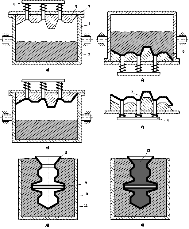 Рис.13Л Литье в оболочковые формы а – модельное приспособление в исходном положении; б – поворот бункера и формирование полутвёрдой оболочки на модельной плите; в – возврат бункера в исходное положение; г – съём затвердевшей оболочки с модельной плиты; д – установка собранной оболочковой формы в опоку и засыпка подпорного материала; е – заливка оболочковой формы расплавом: 1 – поворотный бункер; 2 – металлическая модельная плита; 3 – металлическая модель; 4 – блок подпружиненных выталкивателей; 5 – формовочная смесь; 6 – полутвёрдая оболочка; 7 – затвердевшая оболочка; 8 – склеенная оболочковая форма; 9 – оболочковый стержень; 10 – контейнерная опока; 11 – подпорный материал; 12 – расплав |