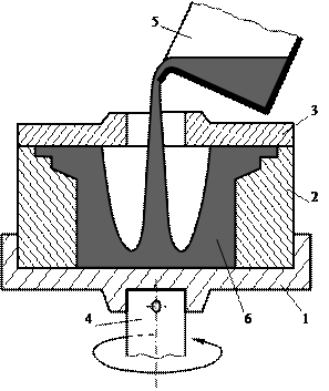 | Процесс изготовления отливки. Расплавленный металл из разливочного ковша заливается в литниковый стержень 2, имеющий углубление для приема расплава. Через отверстия 8 литникового стержня жидкий металл попадает в полость кокиля 3, где при охлаждении расплава формируется отливка. При литье в кокиль используется как металлические, так и песчаные стержни 4. |