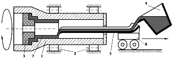 Рис. 15Л Изготовление отливки на горизонтальной центробежной машине 1 – металлическая изложница; 2 – опорные ролики; 3 – стержень, формирующий раструб трубы; 4 – разливочный ковш; 5 – жёлоб; 6 – тележка; 7 – образующаяся отливка