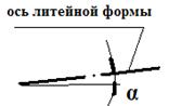 | Процесс изготовления отливки. Металлическая изложница 1 закрепляется в опорных роликах 2 и приводится во вращение электродвигателем (рис. 15Л). Для образования раструба трубы в изложницу перед началом работы устанавливается песчаный стержень 3. После того, как электродвигатель приводит изложницу 1 во вращение (с частотой 150–1200 мин –1), расплавленный металл из разливочного ковша 4 заливается в изложницу по жёлобу 5, установленному на тележке 6. В процессе заливки жёлоб 5 синхронно с ковшом 4 перемещается вправо с постоянной скоростью, что обеспечивает получение одинаковой толщины отливаемой трубы 7 по её длине. Изложница вращается до полного затвердевания залитого расплава, после чего отливку извлекают из изложницы. Иногда, для лучшего заполнения полости формы расплавленным металлом, изложницу устанавливают под углом α.В зависимости от жидкотекучести расплавленного металла значение αлежит в диапазоне α= 5-12 град. Машины с горизонтальной осью вращения применяются для получения отливок большой протяженности. |