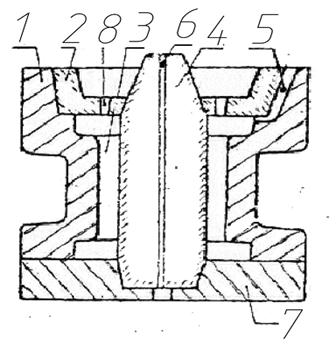 Рис. 16Л. Литье в кокиль 1- полукокиль; 2- литниковый стержень с отверстиями для приема расплавленного металла и формирования верхней наружной поверхности отливки; 3- полость литейной формы для формирования отливки; 4 – центральный стержень для формирования отверстия в отливке; 5- выпор (для контроля степени заполнения полости литейной формы); 6- вентиляционный канал для выхода газов; 7- поддон (для крепления стержня и формирования нижней наружной поверхности отливки); 8- отверстия в литниковом стержне для подвода расплавленного металла в полость литейной формы.