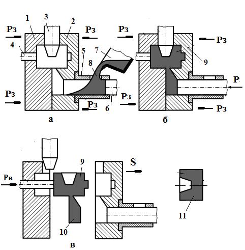 Рис. 17Л Изготовление отливки литьём под давлением а – заливка порции расплавленного металла в камеру прессования; б – подача расплава плунжером в полость пресс-формы и формирование отливки; в – раскрытие пресс-формы и удаление отливки из её полости: 1 – подвижная полуформа; 2 – неподвижная полуформа; 3 – металлический стержень для образования полости в отливке; 4 – выталкиватель; 5 – камера прессования; 6 – плунжер; 7 – разливочный ковш; 8 – расплавленный металл; 9 – отливка с заусенцем; 10- заусенец; 11- отливка после удаления (обрубки) заусенца Рз – усилие закрытия пресс-формы; Р – усилие запрессовки расплавленного металла; Рв – усилие выталкивания отливки; S – перемещение подвижной части пресс-формы. Условие нераскрытия пресс-формы: Рз > Р Процесс изготовления отливки. Перед заливкой пресс-форму обычно нагревают до температуры 100–300°С. Затем внутрь камеры прессования 5, запертой с правой стороны плунжером 6, через окно с помощью разливочного ковша 7 заливают порцию расплавленного металла 8 (рис. 17, а). После этого к плунжеру 6 (рис. 17, б) прикладывается давление, вызывающее движение плунжера влево и последовательное запирание окна для заливки металла и запрессовку расплава в полость пресс-формы с образованием отливки 9. После полного затвердевания отливки 9 (рис. 17, б) подвижная полуформа 1 вместе со стержнем 3 и удерживаемой им отливкой 9 перемещаются влево, раскрывая пресс-форму. Вслед за этим стержень 3 поднимается вверх (рис. 17, в), и выталкиватель 4 извлекает отливку 9 из полуформы 1. |