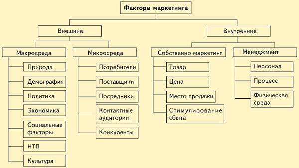 Внутренние факторы маркетинга ¾ товар, цена, место продажи, стимулирование сбыта (рис. 3.1) ¾ являются подконтрольными для фирмы и имеют прямое и непосредственное отношение именно к маркетингу. В литературе они называются по-разному. Нейл Борден, профессор Гарвардского университета, предложивший их в качестве объектов для маркетинговых воздействий, назвал эти четыре фактора маркетинговой смесью (marketing mix) и применил аналогию с рецептом теста для пирога2. Смысл предложения Бордена сводится к тому, что в разных ситуациях, возникающих в конкурентном окружении (т. е. в микросреде), фирма должна направлять свои воздействия (финансовые, трудовые и иные ресурсы) на одну, две или более составляющих маркетинговой смеси, обеспечивая ту или иную пропорцию их сочетания в едином целом в зависимости от ситуации точно так, как это делает хозяйка при приготовлении теста, если хочет придать пирогу тот или иной вкус, внешний вид и др. Позднее маркетинговую смесь стали называть «4p», поскольку все слова, составляющие ее, в английском языке начинаются на букву «p» (produckt ¾ товар, price ¾ цена, place ¾ место продажи, promotion ¾ стимулирование сбыта). Иногда эти составляющие называют еще комплексом маркетинга.
