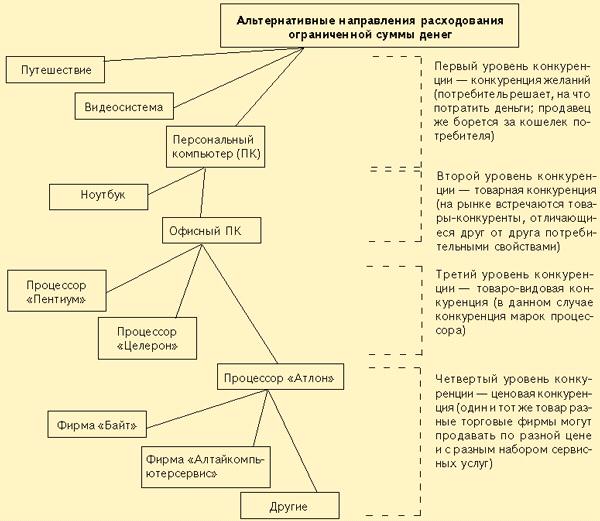 Как следует из рис. 3.4, на первом уровне конкуренции сталкиваются внутренние желания покупателей. Любой покупатель (за редким исключением) всегда обладает только ограниченным количеством денег, и он, следовательно, стоит перед выбором ¾ на что их потратить. Если денег действительно не очень много, то из нескольких альтернатив их возможного расхода он выберет одну. И на первом уровне конкуренции, действительно, могут встретиться такие непохожие товары, как путевки в дома отдыха, видеосистемы, персональные компьютеры (ПК). На чем остановит свой выбор покупатель? Ему очень нужен ПК, но они все, допустим, низкого качества, часто ломаются. Ясно, что он откажется от покупки и истратит деньги либо на путешествие, либо на видеосистему. Но если компьютеры очень хорошие и способны улучшить производственный быт покупателя (допустим, в решении производственных задач на дому), а также скрасить его досуг, то желание иметь такую вещь пересилит все остальные и деньги будут потрачены именно на компьютер. Предположим, что в нашем примере именно так и случилось.