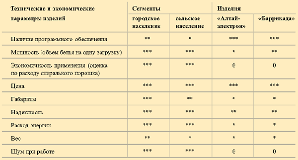 Здесь уместно вспомнить один интересный случай применения автором этих строк данного метода в оценке конкурентоспособности стиральной машины полуавтоматического типа «Алтай-электрон», выпуск которой был утвержден приказом соответствующего министерства в 1986 г., а серийное производство начато в 1989 г. на Барнаульском станкостроительном заводе. В то время многие мощные в интеллектуальном, финансовом и материальном плане заводы, в основном оборонные, готовили конверсионные программы, направленные на выпуск продукции народного потребления. К числу таких разработок относилась и вышеупомянутая стиральная машина, и именно она была взята автором для демонстрации на занятиях вышеописанного метода сегментирования рынка.