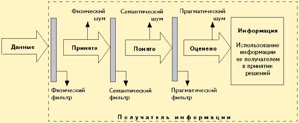 Согласно этой схеме какая-то часть данных на пути движения к получателю первоначально теряется в физических каналах их передачи в форме так называемого физического шума (например, при проведении анкетирования в маркетинговых исследованиях некоторые анкеты оказались неправильно заполненными и их изымают из предстоящей обработки). Дошедшие до получателя данные (принятые) могут быть не все поняты им и восприняты в силу, допустим, недостаточного уровня знаний. Непонятые и невоспринятые данные проходят мимо сознания получателя в форме семантического шума. И наконец, из воспринятых получателем данных некоторая часть может быть просто им проигнорирована из-за того, что окажется излишней или просто непригодной для решаемых задач. В форме прагматического шума эта часть сообщений также проходит мимо сознания получателя. Оставшаяся часть данных и представляет собой собственно информацию, которая может быть использована в решении практических задач. Ясно, что на этапе оценки, по схеме Ясина, происходит и обработка данных, производятся необходимые вычислительные процедуры, сравнения и т. п.