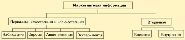 Первичную информацию, выделяя в ее структуре количественную и качественную, принято классифицировать по способам сбора, к которым относятся наблюдения, опросы, анкетирование и эксперименты. Если объединить рис. 5.2 и 5.3 с перечисленными способами сбора первичной информации, то структуру маркетинговой информации можно представить следующим образом (рис. 5.4).