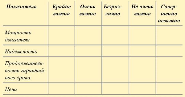 Насколько важны для вас следующие характеристики автомобиля (поставьте символ « ü » в соответствующей клеточке)?