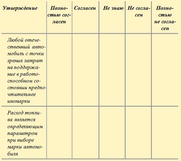 Закрытый вопрос, в котором варианты ответов представлены в виде шкалы Лайкерта, позволяет устанавливать степень согласия (или несогласия) респондентов с некоторыми утверждениями, формулируемыми заранее по поводу тех или иных потребительных свойств товара или других обстоятельств, которые необходимо выяснить в процессе исследования и которые помещаются в строках таблицы. Этим шкала Лайкерта и отличается от семантического дифференциала, где по строкам, как показано в предыдущем примере, размещаются те или иные показатели либо товара, либо фирмы, либо других обстоятельств, имеющих практический интерес для исследователей. Другое отличие шкалы Лайкерта от семантического дифференциала заключается в альтернативах, предлагаемых для выбора, ¾ они, как правило, всегда сформулированы почти одинаково, только с разной детализацией в установлении степени согласия.