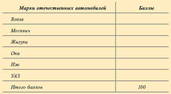 Пожалуйста, расставьте марки автомобилей из прилагаемого списка в соответствии со степенью доверия к каждой из них, оценивая наиболее привлекательную для вас марку как «1», а наименее привлекательную ¾ как «6».