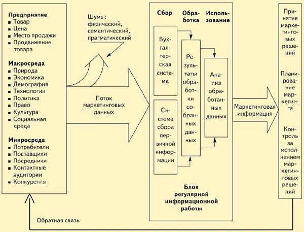 На рис. 5.13 отражены объекты наблюдения, на которые следует обращать внимание при сборе маркетинговой информации (они описаны в параграфах 3.1, 3.2 и 3.3), схема передачи данных, подробно представленная на рис. 5.1, структура маркетинговой информации (вторичной и первичной), описанная в параграфе 5.2, а также процедуры первичной обработки данных, их анализа и затем принятия решений, в том числе и плановых, и наконец, контроля за исполнением этих решений. Создание такой информационной системы на базе современных персональных компьютеров дополнит эпизодические исследования, глубоко изучающие отдельные проблемы, регулярно поставляемой, хотя и по ограниченному объему показателей, информацией о делах фирмы вообще.