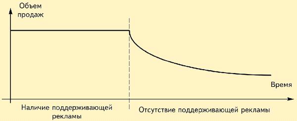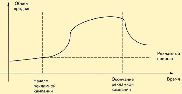 Если рекламная кампания хорошо подготовлена и организована, то после ее начала объем продаж быстро растет, но с постепенным затуханием темпов роста. С прекращением же рекламной кампании объем продаж довольно резко падает, но не до прежнего уровня, обеспечивая тем самым получение фирмой прироста в объемах продаж.