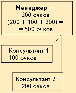 Особенностью MLM -системы является то, что результат деятельности каждого дистрибьютора оценивается по так называемым накопительным и собирательным моделям. Накопительная модель предполагает, что накопление очков, заработанных на продажах, не ограничивается временем. Так, для того чтобы стать менеджером, необходимо набрать 1500 очков. Их можно набрать за один год, месяц или даже минуту, самому совершив крупную покупку. В некоторых MLM -системах, например в фирме «Herbalive», набранные очки учитываются до 1-го числа каждого месяца, а затем списываются и набор начинается сначала. Собирательная модель позволяет дистрибьюторам высших уровней сетей записывать в результат и очки, заработанные привлеченными ими распространителями. Пусть, например, некий менеджер (рис. 12.10) сам заработал 200 очков, два привлеченных им консультанта в свою очередь заработали ¾ первый 100 и второй 200 очков. Тогда общий результат работы менеджера составит 500 очков (200 + 100 + 200).