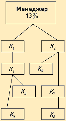 При этом комиссионные менеджера от закупок консультантов слагаются по всей структуре сети, находящейся под менеджером. Так, если под менеджером имеется структура, представленная на рис. 12.11, то комиссионные ему будут начисляться от суммы закупок всех восьми консультантов (от К 1 до К 8), находящихся в иерархии ниже его, а не только от суммы закупок двух из них, привлеченных в MLM -бизнес непосредственно им самим. Таким образом, все консультанты работают и на себя и на менеджера, построившего структуру, в которую они входят, и обеспечивающего ее бесперебойную работу. Но вместе с тем на получение менеджером комиссионных от закупок консультантов налагается одно существенное ограничение ¾ он сам ежемесячно должен делать личные закупки объемом не менее чем на 100 очков. Несоблюдение этого требования не влечет за собой изменения статуса менеджера (перемещения его в ранг консультантов) или отмены (снижения) скидок на закупки. Просто в данном месяце он не получит 13% комиссионных от закупок консультантов. В следующем месяце, если требование по объему личных закупок будет выполнено, менеджер вновь обретет право на получение комиссионных от закупок консультантов.
