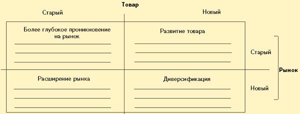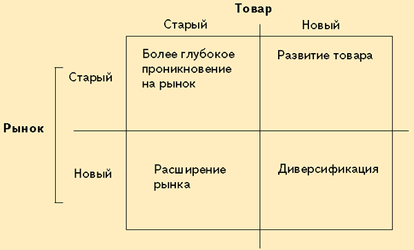 Как формулировать стратегии? Есть несколько формальных методов построения маркетинговых стратегий. Один из них предложен американским профессором Игорем Ансоффом и описан практически в каждом зарубежном учебнике по маркетингу1. Этот метод представляет собой обычную классификационную матрицу ¾ излюбленный прием зарубежных исследователей (рис. 13.3).