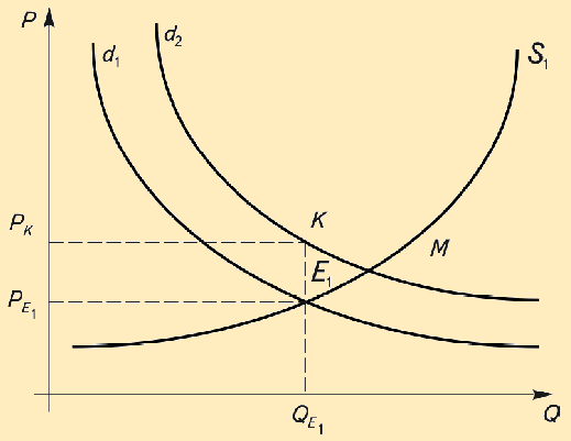 На рис. 10.11 показано, что кривая спроса заняла новое положение d 2, точка же QE 1 (объем предложения) при этом осталась на месте, поскольку, как уже отмечалось, предложение, в силу объективных причин, не может успевать за спросом. Выполняя дополнительные построения на графике, убеждаемся, что цена на швейные машинки теперь поднимется с PE до РK. Такой рост цены обусловлен возникшим дефицитом, а последний ¾ нарушением равновесия рынка. Если бы предприятия так же быстро, как меняется спрос, могли увеличивать и объемы производства, то рынок мог бы сместиться в точку М и возникло бы новое равновесие, которое бы характеризовалось возросшим объемом предложения и более низкой ценой, чем РK. Но поскольку увеличение объемов производства всегда связано с капитальными вложениями и временем на их освоение, то быстро это сделать ни одному предприятию не под силу.