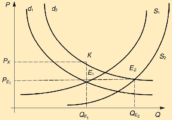 Высокая цена стимулирует увеличение объемов производства. Предприятия начинают осуществлять мероприятия по совершенствованию применяемых технологий, внедрять новые станки, увеличивать численность работников, повышать их квалификацию и т. п., т. е. «включать» в действие фактор К (см. формулу (10.4)) ¾ технологический аргумент функции предложения. И ситуация медленно, но уверенно начнет изменяться в сторону увеличения объемов производства. Внешняя по отношению к рыночной системе сила К начнет действовать в направлении давления на предложение, кривая предложения так же, как и кривая спроса, сместится вправо от начала координат, займет положение S 2, и таким образом образуется новое положение равновесия Е 2(рис. 10.12), при котором объем предложения увеличится и составит величину QE 2, цена же вернется в исходное положение PE 1.