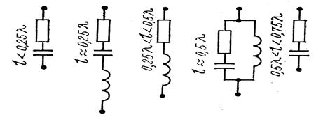 Рисунок 2.6 - Эквивалентные схемы входного сопротивления симметричного вибратора в зависимости от его относительной длины.