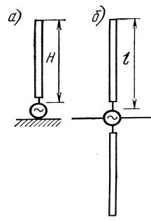 Роль второго плеча вибратора в данном случае играет земля. Такие вибраторы применяются в качестве антенн длинных, средних и коротких волн, а также волн метрового диапазона. Несимметричные вибраторы часто устанавливают на движущихся объектах (автомобилях, самолетах, кораблях). Роль «земли» в этом случае выполняет металлический корпус объекта, к которому подключается один из зажимов генератора. Несимметричный вибратор, расположенный непосредственно над поверхностью идеально проводящей земли (рисунок 3.1а), аналогичен симметричному вибратору в свободном пространстве (рисунок 3.1б), так как функции второго плеча у несимметричного вибратора выполняет зеркальное изображение.