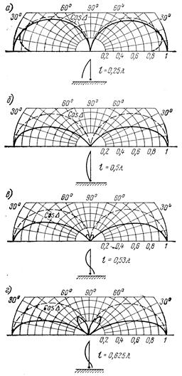 Диаграммы направленности вертикального несимметричного вибратора, расположенного над землей, и распределение тока по вибратору в зависимости от относительной длины, приведены на рис. 3.2. Из приведенных диаграмм направленности видно, что несимметричный вибратор имеет максимальное излучение вдоль поверхности земли.