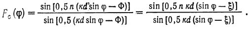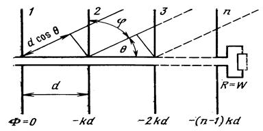 Для получения больших значений КНД и резко выраженных направленных свойств применяют антенны в виде системы большого числа вибраторов, называемых решетками. Токи в вибраторах решетки могут иметь одинаковые фазы. Такие решетки называются синфазными антеннами. Применяются также переменно-фазовые системы, токи в вибраторах которых имеют различные фазы, подчиняющиеся определенным законам. Рассмотрим линейную систему из п ненаправленных излучателей, расположенных на равных расстояниях d друг от друга, возбужденных токами, равными по амплитуде. Такая система вибраторов называется эквидистантной равноамплитудной решеткой.