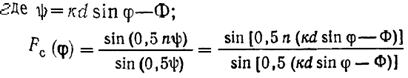 В ы в о д. Щирина ДН синфазной решетки сужается с уменьшением длины волны, увеличением числа вибраторов и увеличением расстояний между ними. Если в синфазной решетке уменьшить число вибраторов и увеличить расстояния между ними так, чтобы сохранить неизменным произведение nd, т. е. линейные размеры антенны, то ширина главного лепестка останется неизменной, но возрастут уровни боковых. При