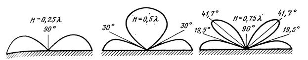 Рис. 3. Диаграммы направленности горизонтального вибратора при разных высотах подвеса