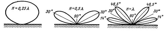 Выводы. Антенна с горизонтальными вибраторами вдоль идеально проводящей земли не излучает. Максимум излучения направлен под некоторым углом к поверхности земли. Чем больше высота