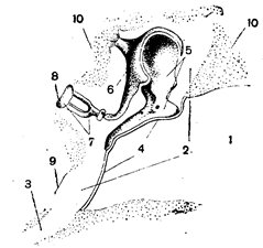 Рис. 1. Полусхематическое изображение среднего уха: 1— наружный слуховой проход', 2— барабанная полость; 3 — слуховая труба; 4 — барабанная перепонка; 5 — молоточек; 6 — наковальня; 7 — стремя; 8 — окно преддверия (овальное); 9 — окно улитки (круглое); 10— костная ткань.