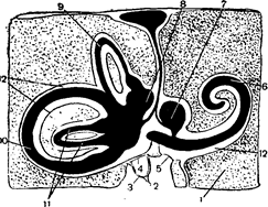 Рис. 2. Общая схема костного и находящегося в нем перепончатого лабиринта: 1 — кость; 2 — полость среднего уха; 3 —стремя; 4 — окно преддверия; 5— окно улитки; 6 — улитка; 7 и 8 — отолитовый аппарат (7 — саккулус или круглый мешочек; 8 — утрикулус, или овальный мешочек); 9, 10 и 11 — полукружные каналы 12 — пространство между костным и перепончатым лабиринтами, заполненное перилимфой.
