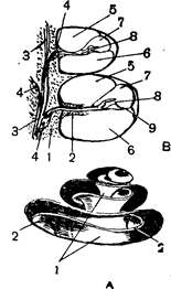 А — костный канал улитки; В — схема поперечного разреза части улитки;1 — костный стержень; 2 — спиральная костная пластинка; 3 — волокна улиткового нерва; 4 — скопление тел первого нейрона слухового проводящего пути; 5 — лестница преддверия; 6—лестница барабана; 7— улитковая часть перепончатого лабиринта;8 — кортиев орган; 9— основная пластинка.
