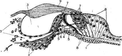 Рис. 4. Схема строения кортиева органа: 1 — основная пластинка; 2 — костная спиральная пластинка; 3 — спиральный канал; 4 — нервные волокна; S — столбовые клетки, образующие тоннель (6); 7 — слуховые, или волосковые, клетки; 8 — опорные клетки; 9 — покровная пластинка.