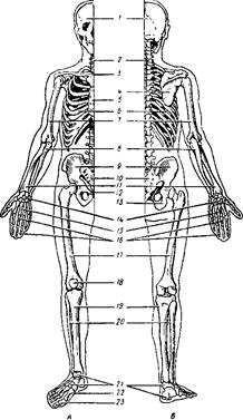 Рис 1 Скелет человека спереди (А) и сзади (Б): 1 — череп; 2 — позвоночный