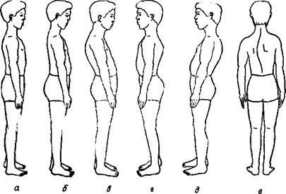 Рис. 2 Виды осанки: а — нормальная; 6—выпремленная; в — кифотическая; г — лордотическая; д — сутуловатая; е — сколиотическая