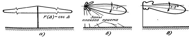 (рис. 11.1,а). Построение антенны с такой ДН представляет некоторые трудности. На практике применяют многоэтажные антенны с узкими ДН в вертикальной плоскости, сужая главный лепесток до 2. .. 4° с одновременным наклоном направления максимального излучения на 1...20 от горизонтальной плоскости к поверхности Земли. Антенны с узкими ДН являются многолепестковыми с несколькими направлениями глубоких минимумов, за счет которых образуются зоны плохого приема (рис. 11.1,6). Для исключения таких зон напряженность поля в минимумах не должна быть меньше 0,1 от напряженности поля главного максимума (рис. 11.1 в). Для устранения вредного влияния фидерного эха на работу телевизионного и звукового стереофонического вещания КБВ в фидере должен быть достаточно большим — не менее 0,85. Высоко расположенные антенны подвержены большим ветровым и гололедным нагрузкам, а так же воздействию грозовых разрядов. Для повышения надежности и молниезащиты вибраторы антенн должны выполняться жесткими с непосредственным заземлением, снабжаться устройством прогрева для устранения гололеда или обтекателями, закрывающими вибраторы от внешних воздействий.
