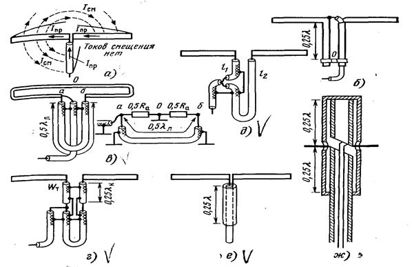 А с и м м е т р и я токов вибратора. К несимметричной антенне несимметричный фидер можно подключить непосредственно: центральный проводник к вибратору, а внешний к заземлению, противовесу или корпусу, если входное сопротивление антенны равно волновому сопротивлению фидера. В противном случае между антенной и фидером ставят согласующий трансформатор. Непосредственное подключение коаксиального фидера к симметричному вибратору, как это показано на рис. 11.2,а, без симметрирующего устройства вызывает появление различий между амплитудами тока в плечах вибратора и приводит к возникновению тока на поверхности внешнего проводника фидера. Асимметрия токов в плечах вибратора вызвана тем, что между плечом, подключенным к центральному проводнику коаксиального фидера, и внешним его проводником образуются токи смещения. Второе плечо вибратора имеет потенциал внешнего проводника фидера, разности потенциалов здесь нет и токов смещения не образуется. Асимметрия токов в вибраторе несколько искажает его ДН. Более существенное влияние оказывают токи на внешнем проводнике коаксиального фидера. Результатом их действия является антенный эффект фидера. Эти токи при работе горизонтального вибратора на передачу создают паразитное поле излучения с вертикальной поляризацией. В случае горизонтальных приемных антенн за счет асимметрии происходит прием вертикального поля помех.