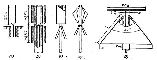 Вертикальные вибраторы: а— штыревой; б — коаксиальный; в —с нижним плечом из проводов; г — обаплеча из проводов или трубок; д — диско-конусный