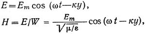 Как показано на рис. 1.5, векторы Е и Н в пространстве перпендикулярны друг другу. На рис. 1.8 изображено распределение поля плоской гармонической волны в идеальном диэлектрике для одного определенного момента времени.