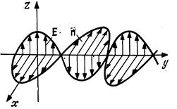 Рис. 1.8. Распределение в пространстве полей Е и Н плоской электромагнитной волны в определенный момент времени.