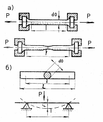 Предел прочности при растяжении в кг/мм2 определяется на разрывной машине как отношение нагрузки Р в кГ, необходимой для разрушения стандартного образца (рис.5, а), к площади поперечного сечения образца в мм2.